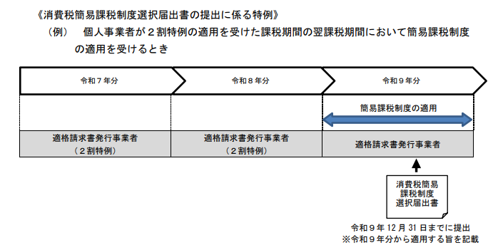 (注) 令和8年分は2割特例を適用していることが前提のため、本則課税を選択しているのであれば、原則に従い翌課税期間(令和9年分)の初日の前日までに、「消費税簡易課税制度選択届出書」の提出が必要となります。